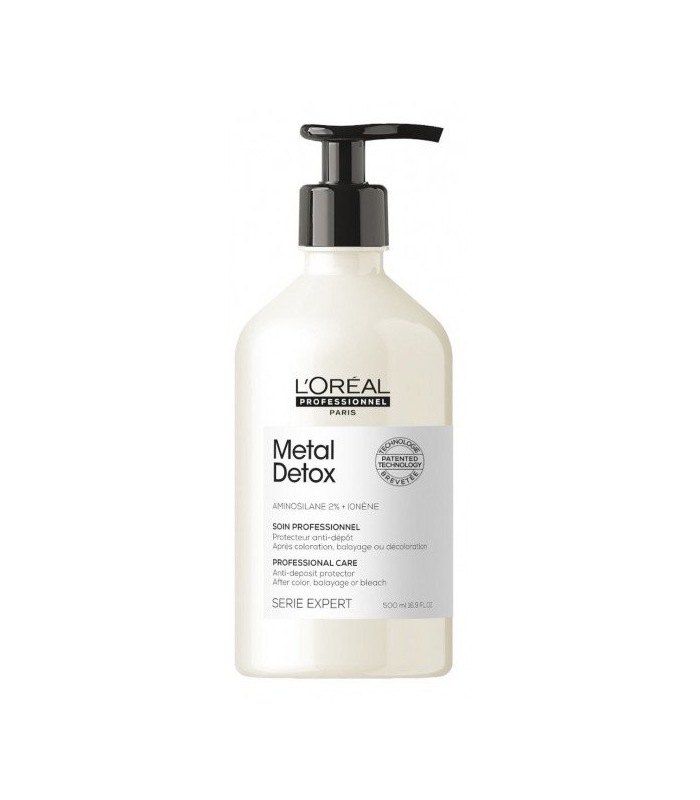 Acondicionador profesional Loreal Metal Detox que neutraliza metales, como el cobre, depositados en la fibra capilar por el agua. Su fórmula con Glicoamina protege el cabello de roturas, mantiene la intensidad del color y aporta brillo. Para un cabello más fuerte, suave y saludable.
