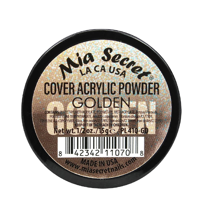 Polvo acrílico profesional Mia Secrets en tono Cover Golden de 1/2 oz, formulado para extensiones de uñas con alta cobertura. Proporciona un acabado dorado vibrante, durabilidad superior y aplicación suave, ideal para crear diseños impecables y estéticos con un toque lujoso.