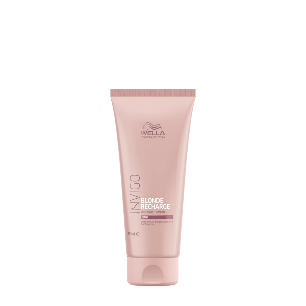 Acondicionador Wella Invigo Blonde Recharge de 200 ml, formulado con pigmentos de color. Su acción recarga y mantiene la luminosidad de los tonos rubios, ofreciendo acondicionamiento y vitalidad al cabello.